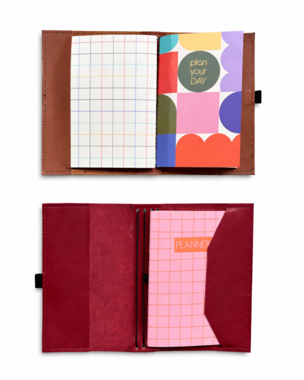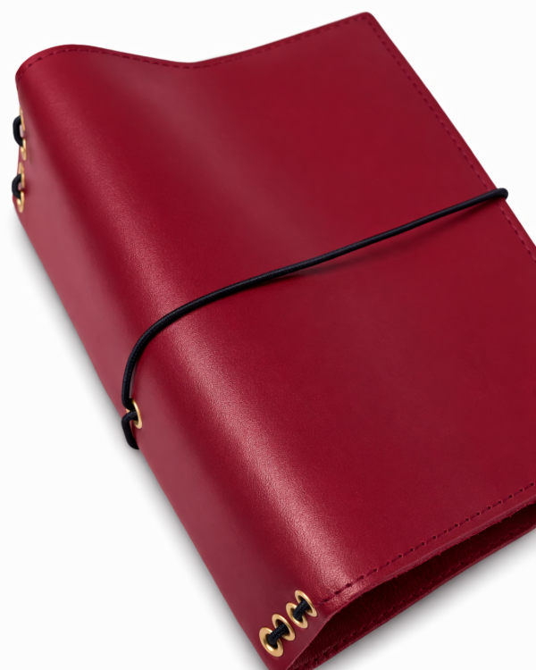 Funda para cuadernos estilo Midori, confeccionada en 100% cuero con ojalillos metálicos y sistema de elásticos. Cuenta con dos compartimentos que pueden utilizarse como "bolsillos" o marcadores de página junto a un elástico para guardar una lapicera.